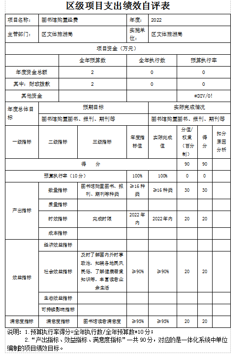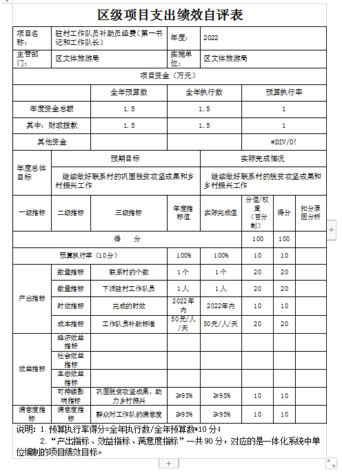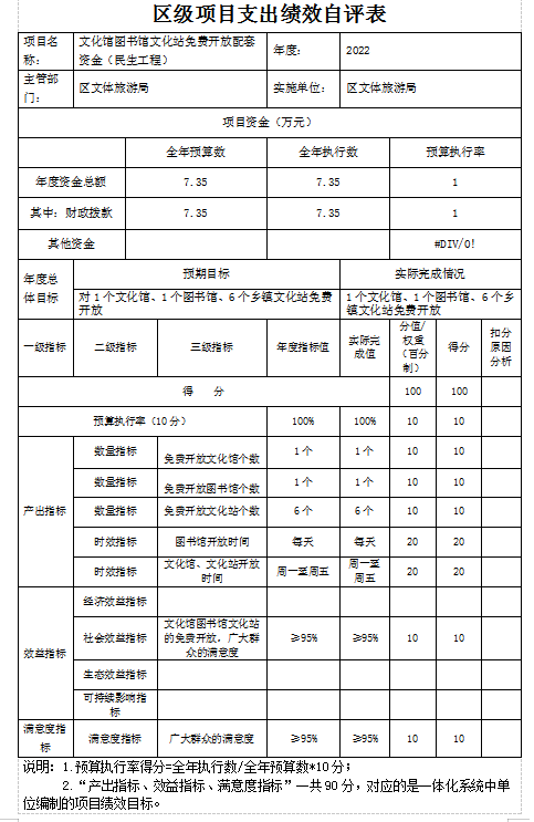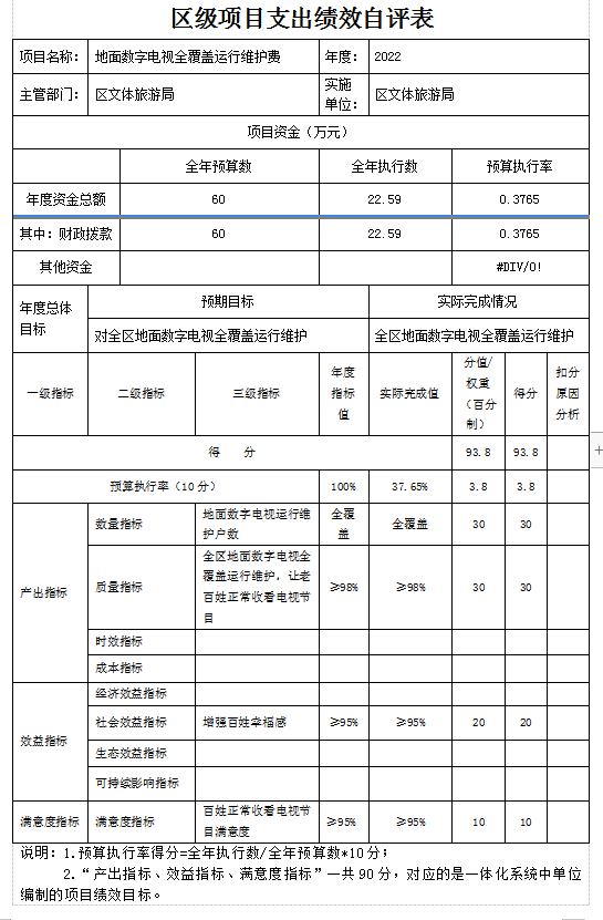 2022年區(qū)文體旅游局項目預(yù)算持續(xù)做好公共文化服務(wù)體系建設(shè)、兩館一站免費開放工作,開展豐富多彩的文化惠民活動,開展鄉(xiāng)村振興工作和完成文化惠民的各項工作任務(wù);做好基站及桿線路維護工作,確保廣播電視安全播出;做好體育場免費開放工作,各類節(jié)假日活動,統(tǒng)籌管理各協(xié)會,搞好老年體育工作,做好青少年體育工作;加強旅游基礎(chǔ)設(shè)施建設(shè),做好旅游服務(wù)質(zhì)量提升工作,抓好旅游市場監(jiān)管工作;加強日常及節(jié)假日的巡查力度。完成目標(biāo)任務(wù)的100%。