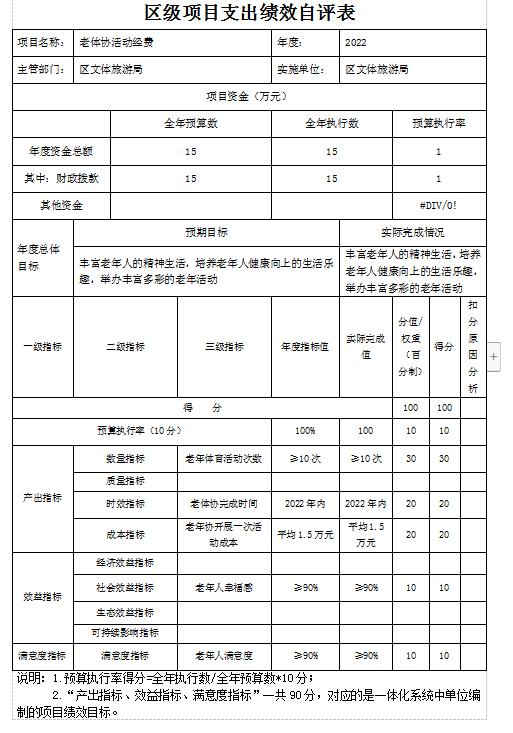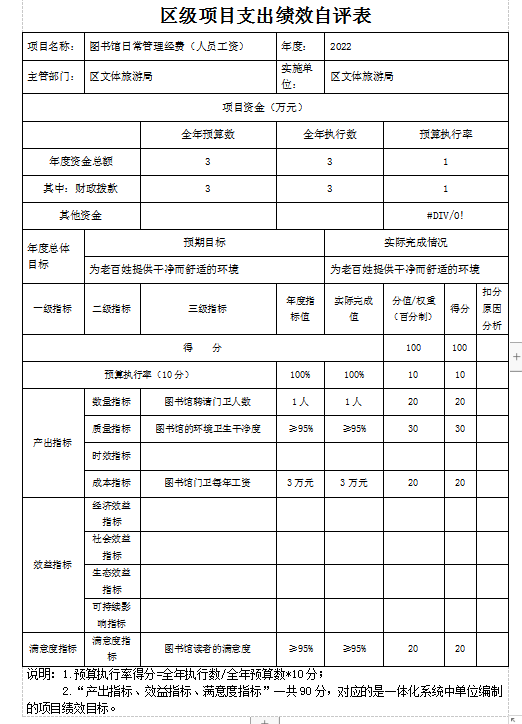 部門整體自評認真仔細質(zhì)量高、績效目標(biāo)和自評情況、評價結(jié)果按區(qū)財政要求按時公開。在自評中認真總結(jié)經(jīng)驗和工作中的注意事項,為來年工作做得更好打好基礎(chǔ),為財政部門和上級業(yè)務(wù)主管部門安排項目資金提供參考。