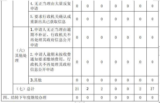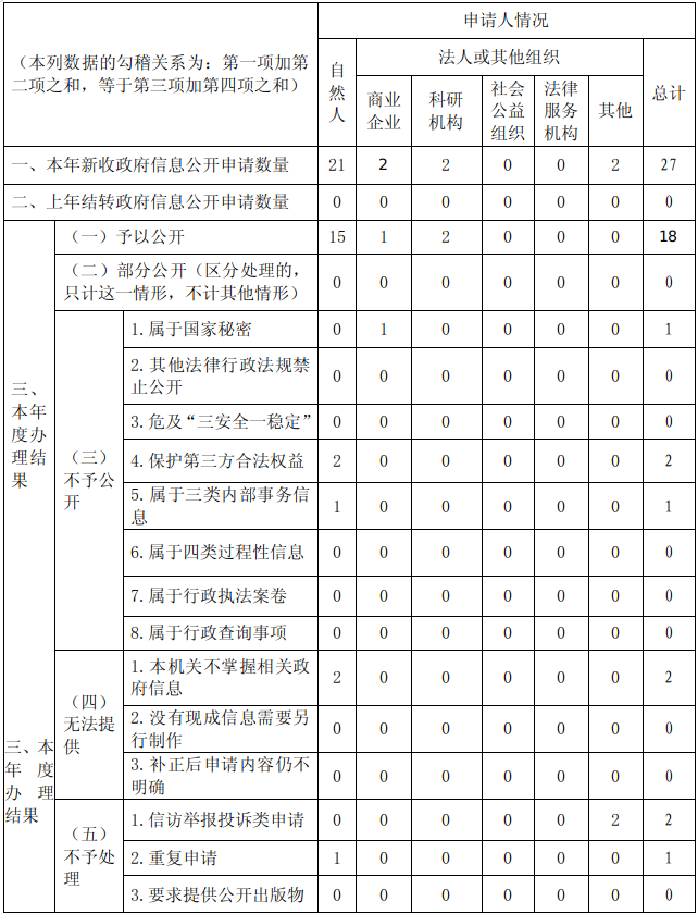 (二)依申請(qǐng)公開。為提升全區(qū)行政機(jī)關(guān)辦理依申請(qǐng)公開政府信息工作規(guī)范化水平,我區(qū)嚴(yán)格按照《樂山市人民政府辦公室<關(guān)于印發(fā)政府信息依申請(qǐng)公開辦理操作指南>通知》(樂府辦〔2024〕23號(hào))要求執(zhí)行,做好申請(qǐng)公開登記、審核、辦理、答復(fù)、歸檔工作。2024年全區(qū)共收到依申請(qǐng)公開27件(其中21件為自然人申請(qǐng),2件為商業(yè)企業(yè)法人代表申請(qǐng),2件為學(xué)生用于科研參考申請(qǐng),2件為其他申請(qǐng)),均依法依規(guī)辦理完畢。依申請(qǐng)公開引起的行政復(fù)議5件,其中終止復(fù)議2件。